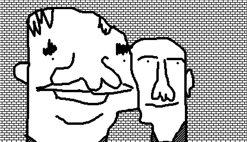One of the men makes strange noises while the other one closes his eyes and acts as his translator.